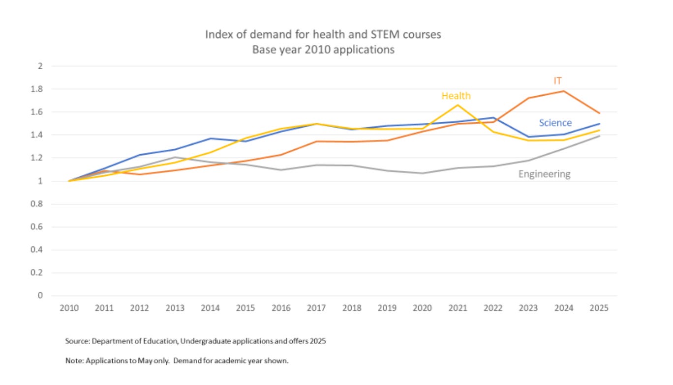 Norton’s charts below show a fifteen-year comparison. As Norton notes “To make the charts below easier to read I converted the varying absolute application numbers to an index with base year of 2010. The science index is 1.5, meaning that in 2025 it had 50% more applications than in 2010”.